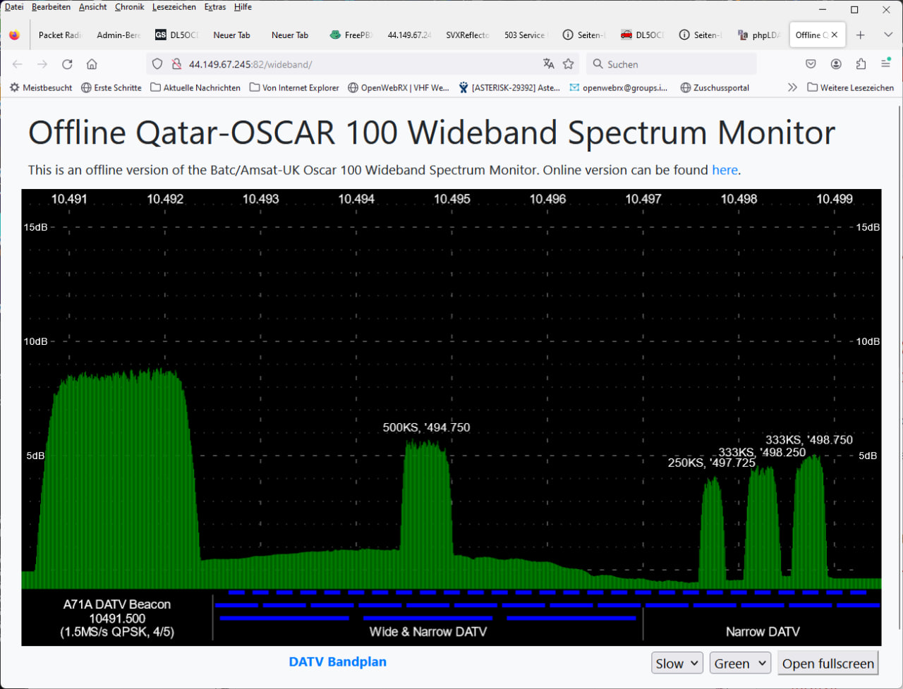 Hier läuft nun ein QO-100 Wideband Monitor, ähnlich wie der in Goonhilly UK. Die Technik ist unabhängig vom Internet und wird aus einem Airspy R2 und einem 125cm Offset Spiegel gespeist.
